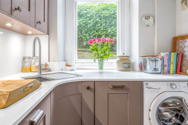 The painted furniture allowed us to curve the end of the kitchen to create a corner sink, which provided extra working space in front of the window above his washing machine. We complemented the furniture with a quartz worktop and splashback.